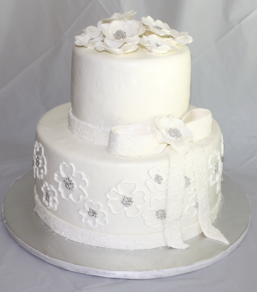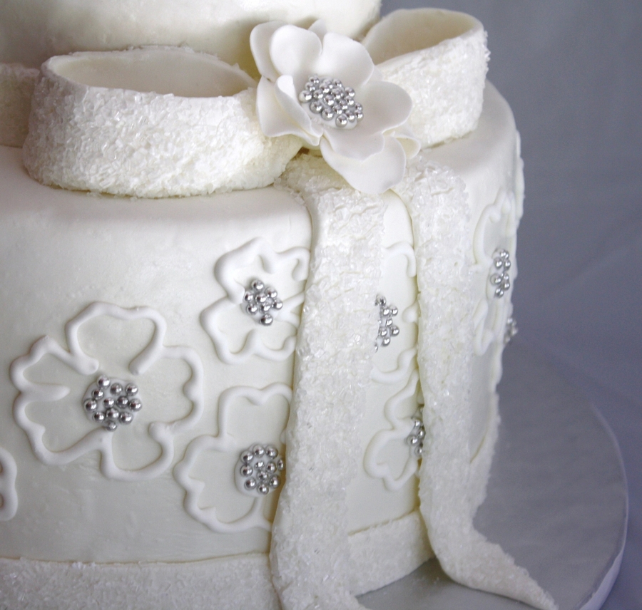 Made this for a couple celebrating their silver anniversary. Its all decorated in MMF and Royal icing piping. I gave the ribbon border and bow sparkle by lightly brushing it with royal and then adhering sparkly sugar to it. I wanted the cake to look simple and elegant.