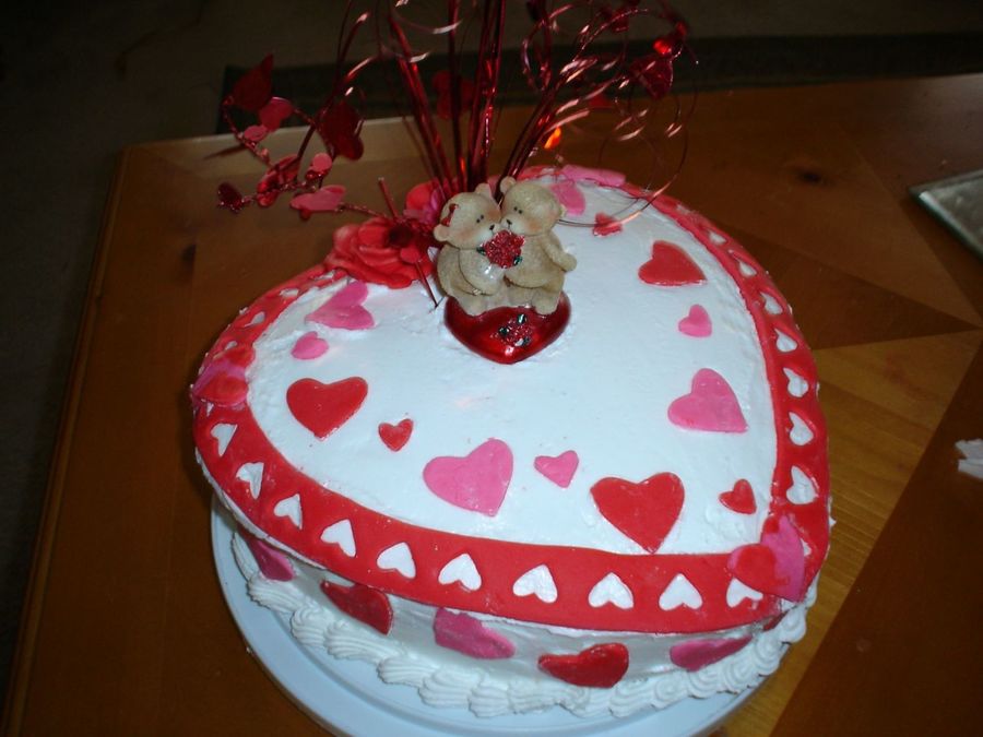 cake iced in buttercream icing and hearts made out of rolled fondant.