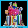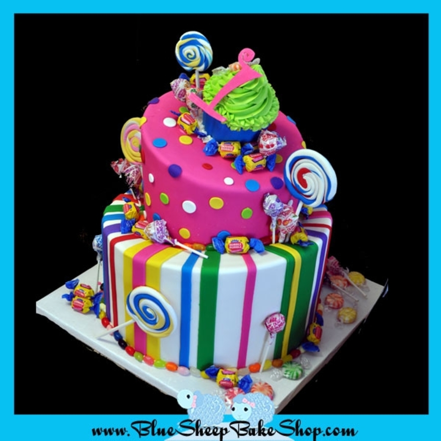 Two tiered brightly colored candy land themed first birthday cake