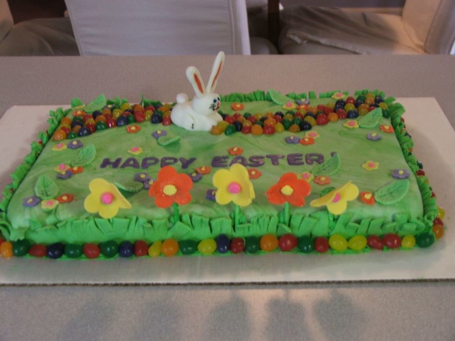 This is a fondant cake with a fondant bunny. The path is made of jelly bean halves.