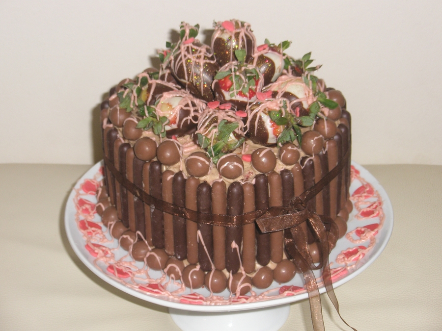 A chunk of chocolate love for my chocolate loving hunk. Heart shaped hershey chocolate cake filled and frosted with chocolate cream cheese frosting, surrounded with dark and milk chocolate finger and maltesers, topped with chocolate dipped strawberries sprinkled with edible glitter and fondant hearts.