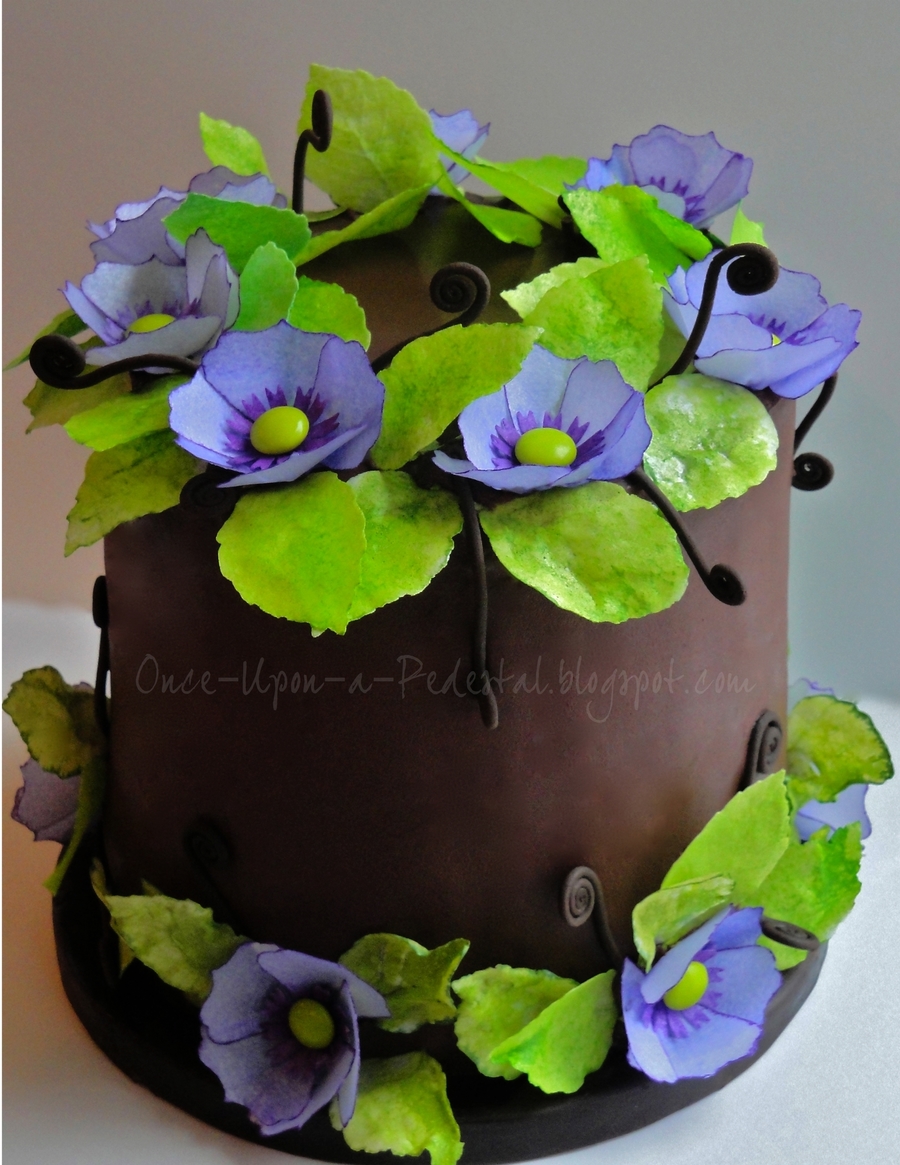 Handpainted flowers with detailed edges, m&m center. Leaves are also wafer paper. Devil's Food with espresso BC and dark chocolate ganache. Chocolate fondant fern coils.