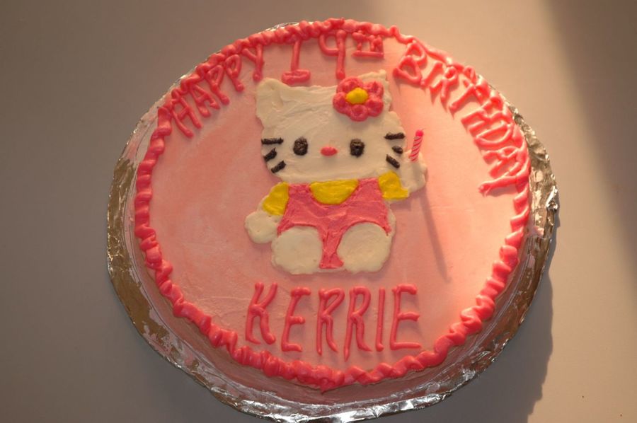 I really like the color of the top of the cake and your writing is very good. I like how Kitty is holding the candle too. Very cute!