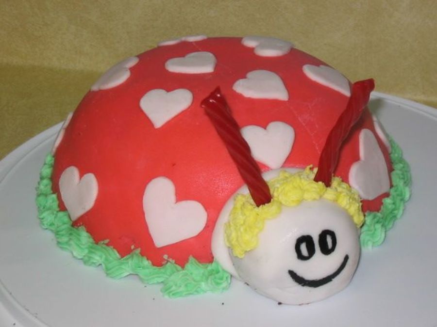 Chocolate cake with whipped cream and maraschino cherries filling, covered and decorated with Fondant. Antennae are Twizzlers.