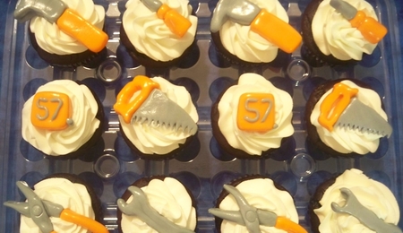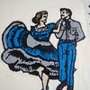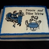 Square dancing clubs 29th anniversary. Vanilla cake with buttercream frosting. 11x15 cake with the entire top one big frozen buttercream transfer. their colors for the party are blue and silver. and the table cloth is made to match one of the fabrics in their dresses. This was my first time doing a buttercream transfer like that.