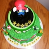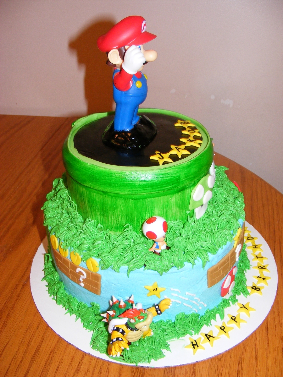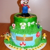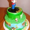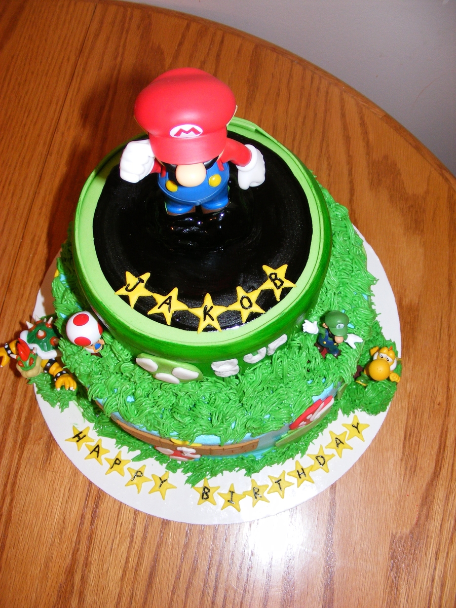 Super Mario cake I made for my nephew's birthday. Handpainted fondant pipe. Fondant covered cake, hand made fondant decorations. Characters are all figurines.