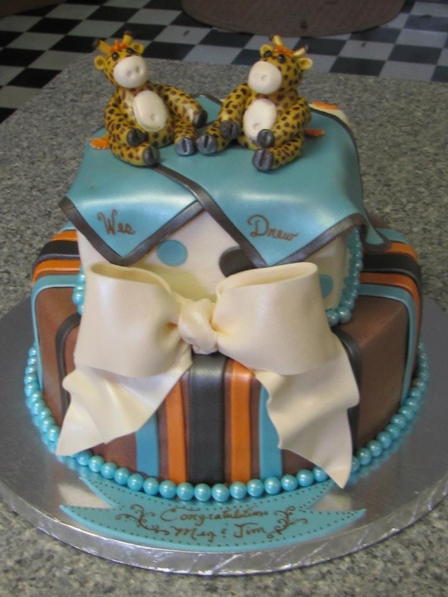 Baby shower cake for twins... buttercream iced cakes with fondant decorations...... "sixlets" candy used for borders