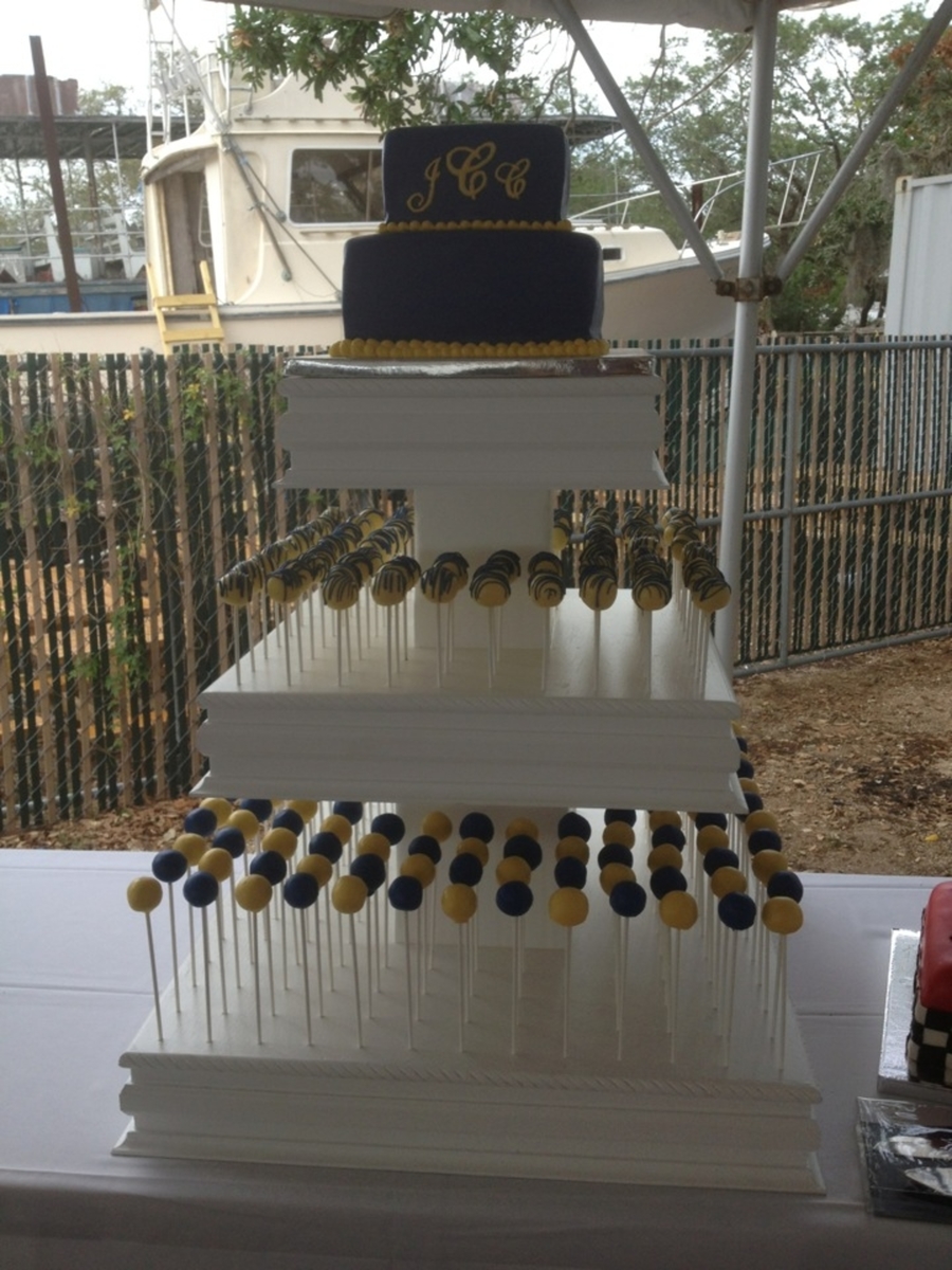 Royal Blue and Yellow cake pops. 2 tier square cake on top. Custom stand was made by brides father. bottom tier is vanilla and chocolate cake pops, middle tier is oreo cake pops and top is chocolate cake covered in fondant.