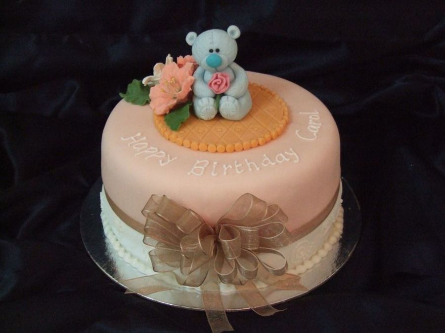 Carrot cake with cream cheese filling covered with sugarpaste. Bear is mmf. Flowers royal icing.