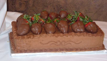 this is my first attempt at making one of these, and I'm totally a fan. Cake is 10" chocolate fudge cake with peanut butter ganache filling. Kit kats are adhered with chocolate ganache and top of cake is filled with Reeses pieces. The one thing I'd do differently is use a different kind of ribbon for the bow. Satin ribbon is a little limp for this.