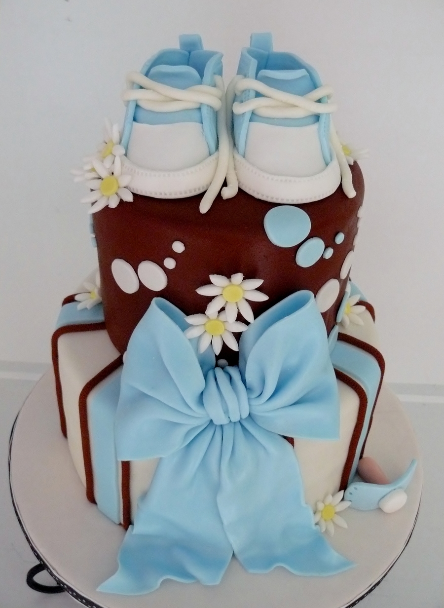 Baby shower cake with baby converse sneakers topper. This is a borrowed design.