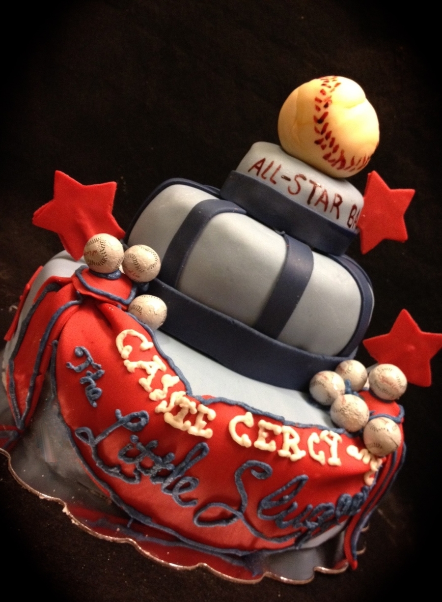 This baby shower cake is reflecting a baseball theme. The bottom tier is a four layer yellow cake with raspberry filling. The middle tier is three layer. The baseball and covering is fondant.