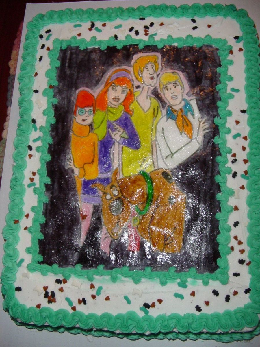 I used a picture our of a coloring book and transferred it on to edible paper. Then I painted the characters with colored piping gel.