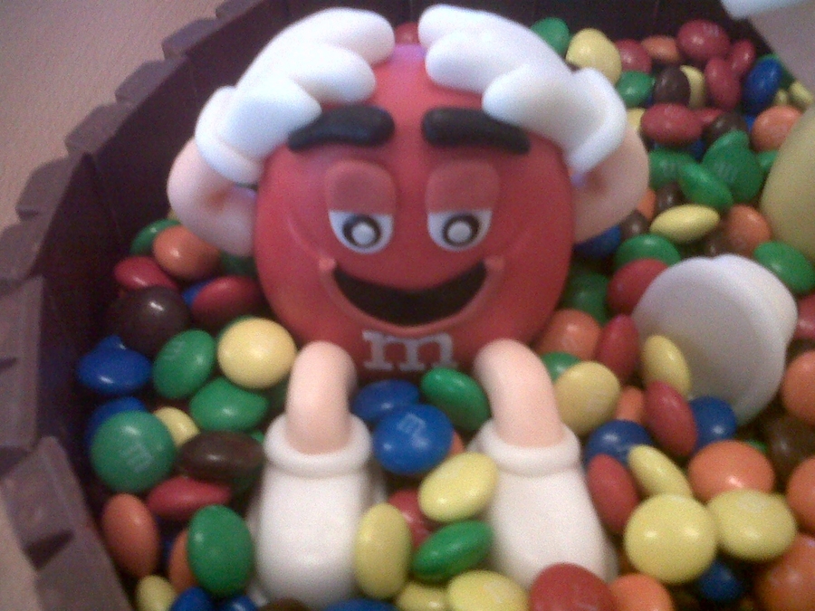 This is an m&m chocolate birthday cake made with a chocolate madeira sponge with kit kats around the outside. Also I have made the m&m figures by hand using fondant and added m&m's to fill in the middle section of thee cake. Also a rainbow bow was added for a bit of extra decoration.