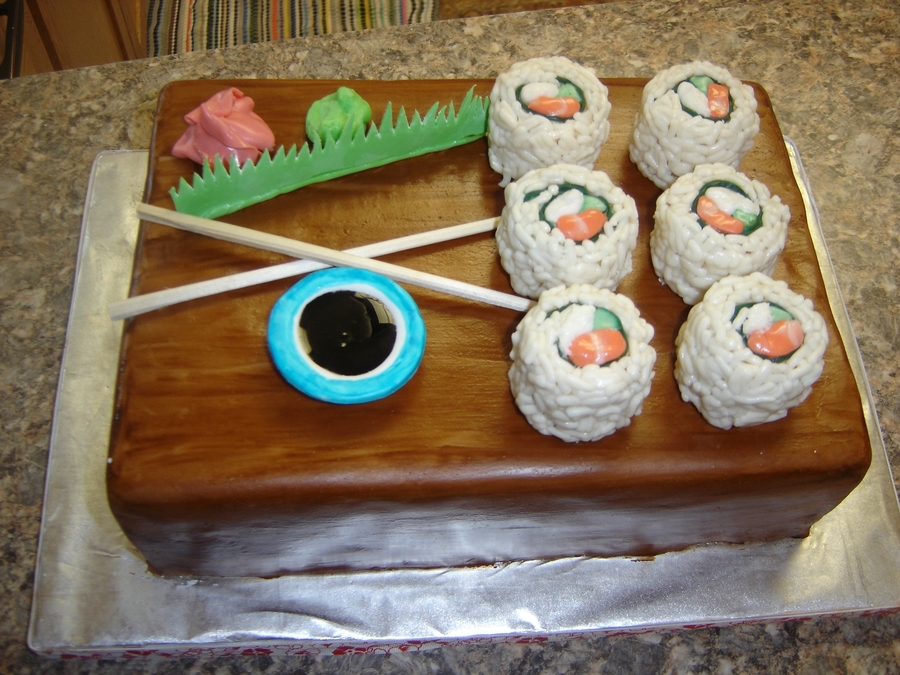 chocolate cake filled with cookie dough covered in fondant. the philly rolls are RKT with fondant details.