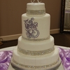 This cake was created for a wedding reception that was full of sparkle & drama! It is covered in fondant, with hand-painted details, pearls & lots of beautiful rhinestones.