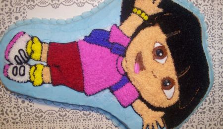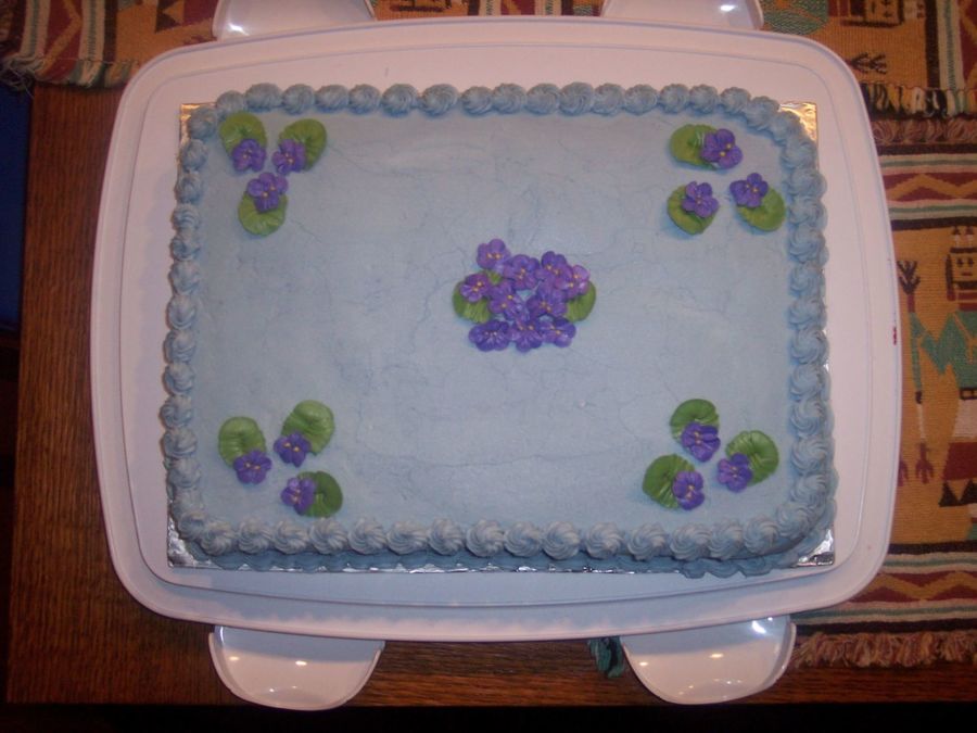 Chocolate cake with buttercream frosting. Royal icing violets.
