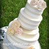 Buttercream tiers with ivory fondant stripes. Accented with supgar peonies and rhinestone ribbon and monogram topper.