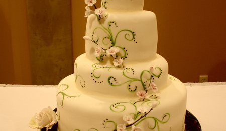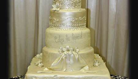 Butterpecan cakes with champagne colored bows and pearl brooches from Sugar Delites.