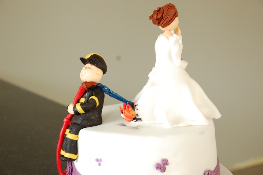 A weddingcake for a fireman and his bride. There needed to be a firmeman on it and it needed to be funny