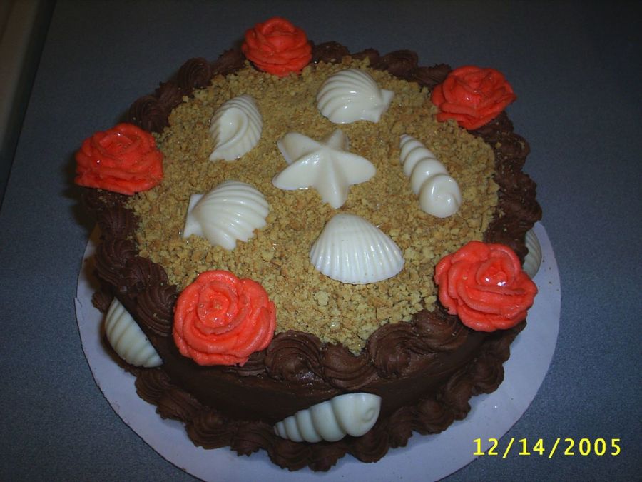 This is a cake I made for one of the daycare moms. Devils food cake w/choc BC icing The shells are choc candy molds and the top is crushed graham cracker.