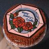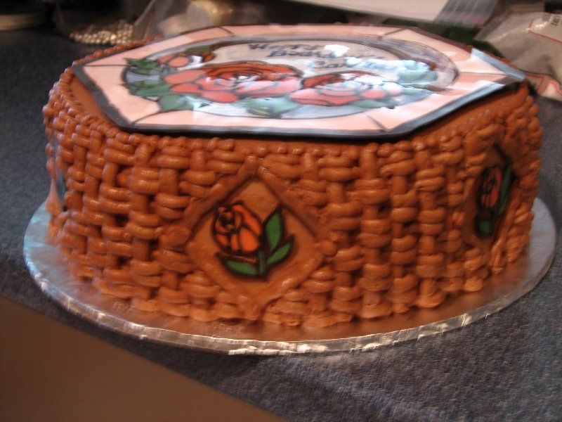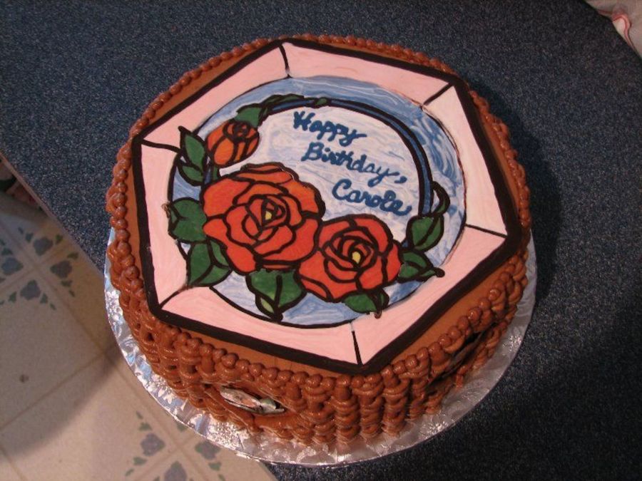 A friend bought a cake certificate at a fundraiser. She wanted chocolate with roses and some blue--and that's what she got! It's double chocolate fudge with raspberrry filling & chocolate malt icing. The top is a stained glass style chocolate transfer.