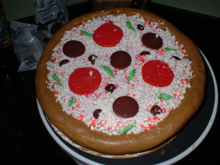 this was a cake for a pizza hut managers birthday...you cant see it very well but i used red chocolate meltaways and melted one over a plastic toy tomato slice to get the tomato seed impresion...it will be presented in a pizza box