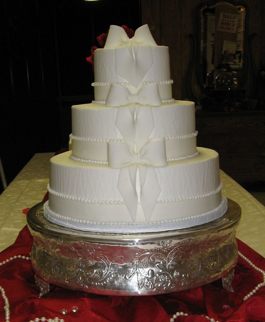 Hey, it works. I thought you must have a moire impression mat. I wonder if there is such a thing...would be very pretty sprayed with pearl dust! (Very pretty cake...love the design and bows)