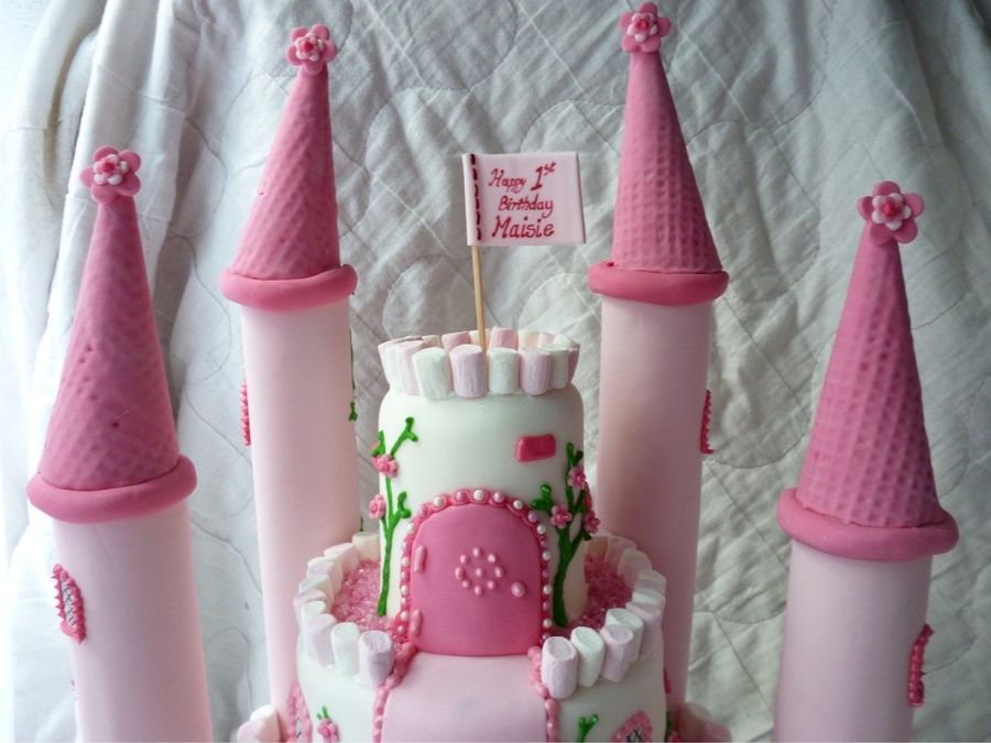 Vanilla sponge with raspberry jam and vanilla buttercream filling Covered with fondant icing Towers are hardened gumpaste Detaisl in fondand and royal icing