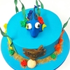 Finding Nemo cake featuring Dory as the star! All decorations are hand modeled out of modelling chocolate except the seaweed which is gummpaste. The "sand" is brown sugar mixed with ground almonds.