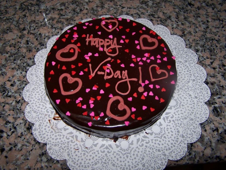 Red Velvet cake with whipped chocolate ganache filling. Covered with coffee-chocolate ganache. Wording is royal icing.