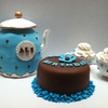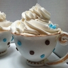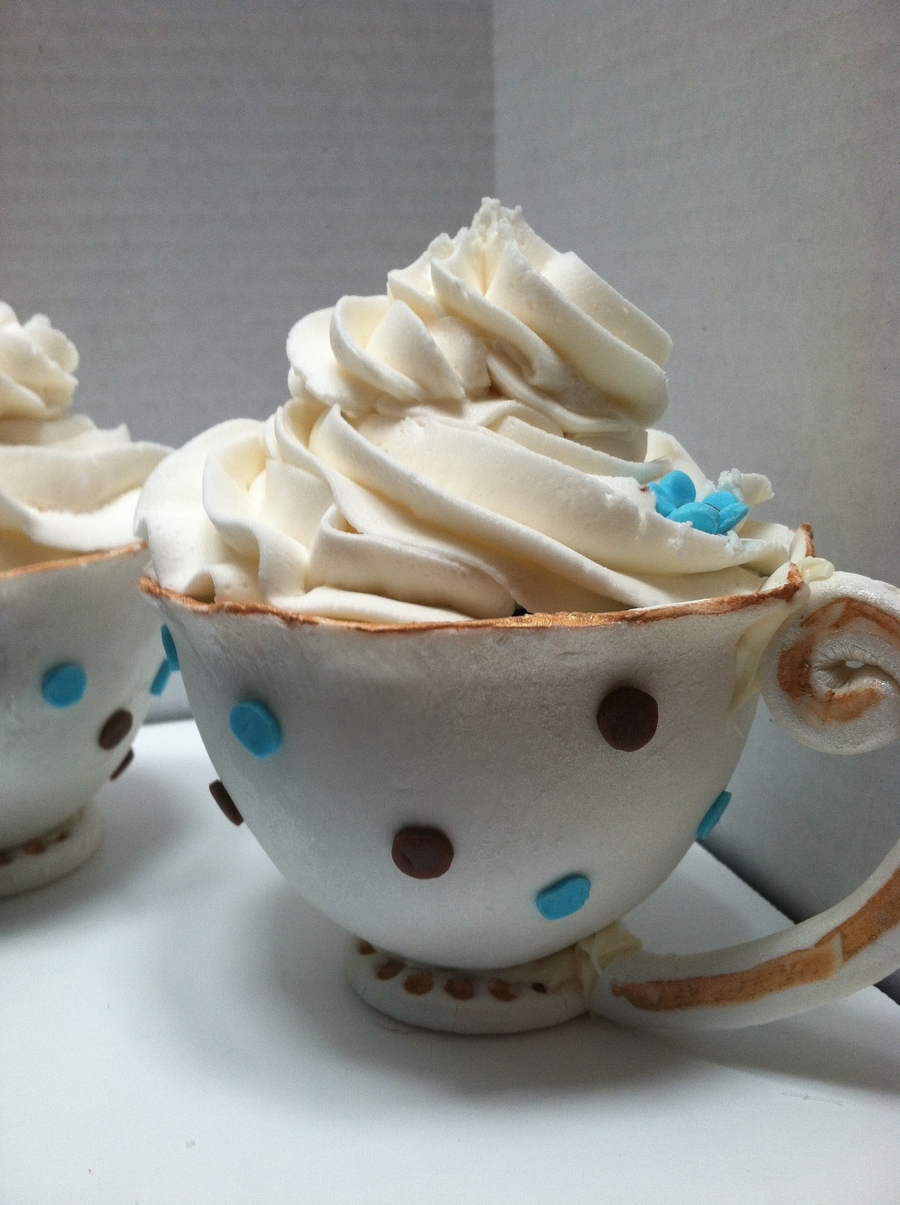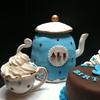 Tea pot made out of 6 inch rounds and 6 inch wonder mold pan Tea cups made out of gumapaste and then filled with a cupcake