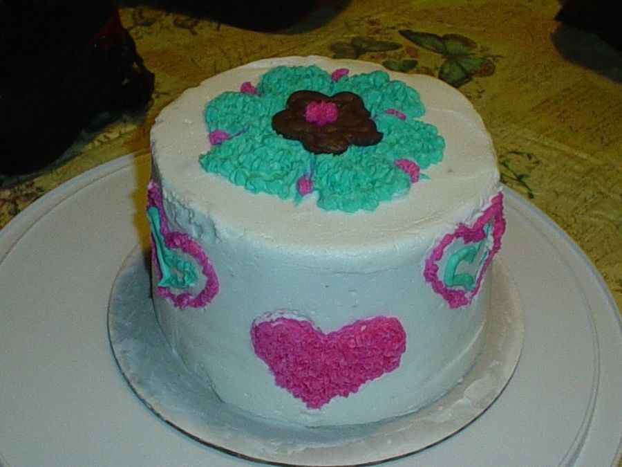 cindy6250 on 27 Feb 2007 , 2:41pm Very good job. I love the big flower on top and the hearts around the side are a nice touch. I think I see a budding cake decorator.
