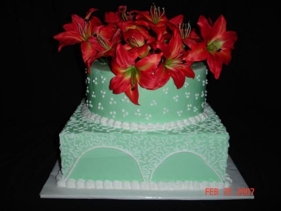Cake Dummy with corneli lace and dots with artificial flowers. Not real happy that my "arches" aren't consistent, but this was the last of 4 cake dummies I did this weekend and my hand is ready to fall off! Oh well, overall I like the idea, I just need more practice. Thanks for looking!