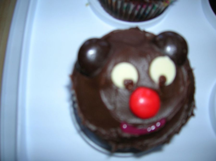 very cute! It looks so rich and chocolatey . . . I wish I could just take a bite but I don't know if I could bite into a cake with as cute a smile as that one! He looks like he's just imploring us not to chow down on him!