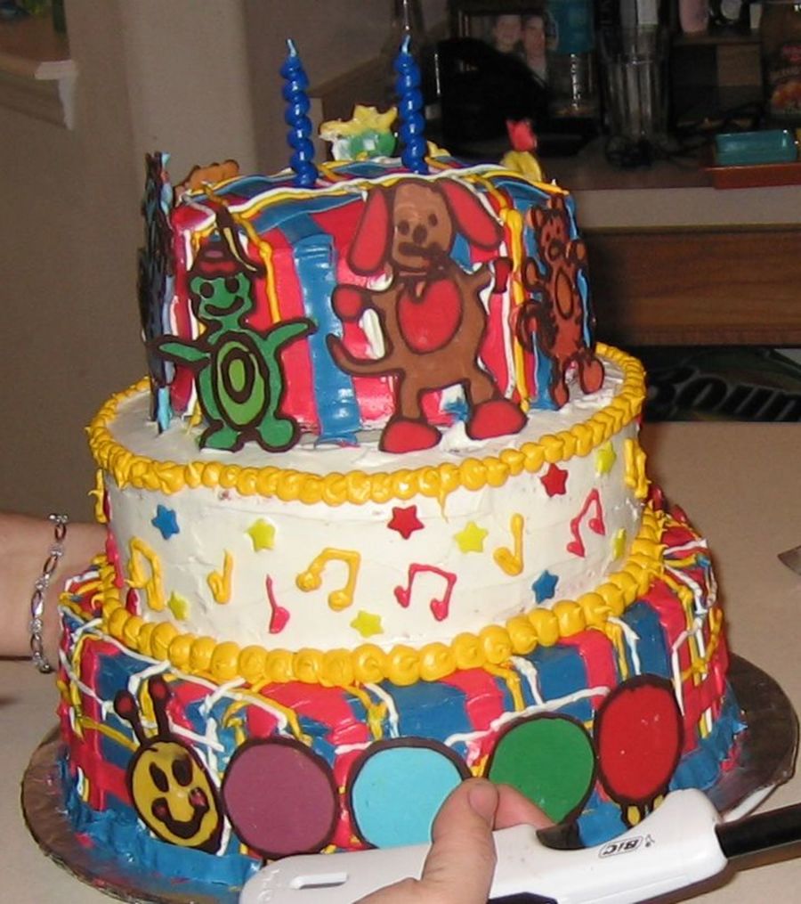 3-tiered yellow cake with buttercream icing, baby-einstein animals made with melted candy-coating a couple days in advance.