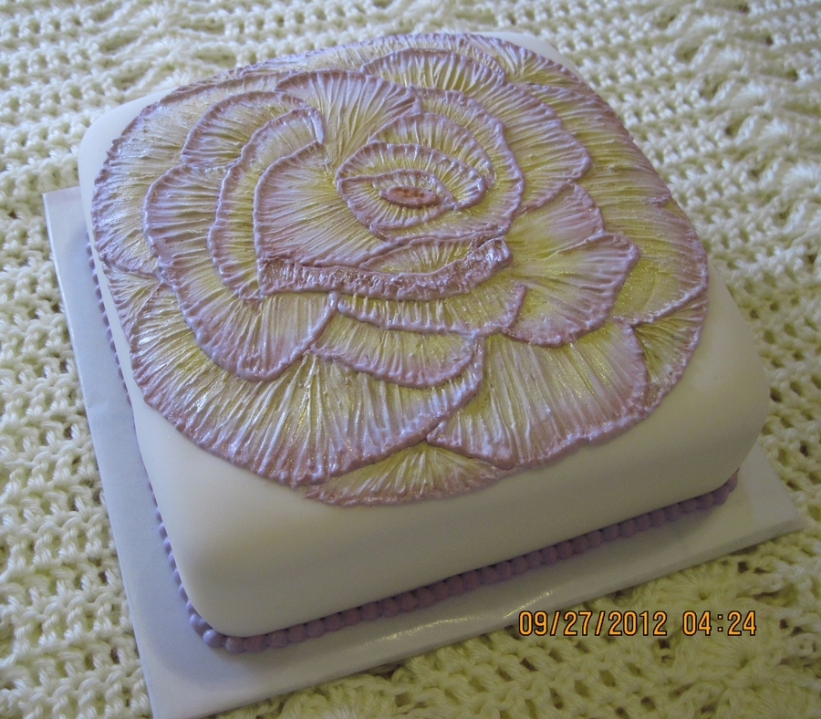 A brush embroidery rose. This is a practice cake for an online class given by Colette Peters on Craftsy, Vintage Cakes, Modern Method. I've used royal icing for the embroidery and then colored the rose with luster and petal dust mixed with lemon extract. This is a gluten free cake flavored with Chai Latte mix from Trader Joes.