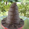 Harry Potter's Sorting Hat. 4 layers, 8,7,6,5 inch rounds. Rice crispy treats formed into a cone makes the top of the hat. Rolls of fondant under the main layer of fondant make the wrinkles. I used special dark coco in my chocolate marshmallow fondant, so he's a shade darker than he should be.