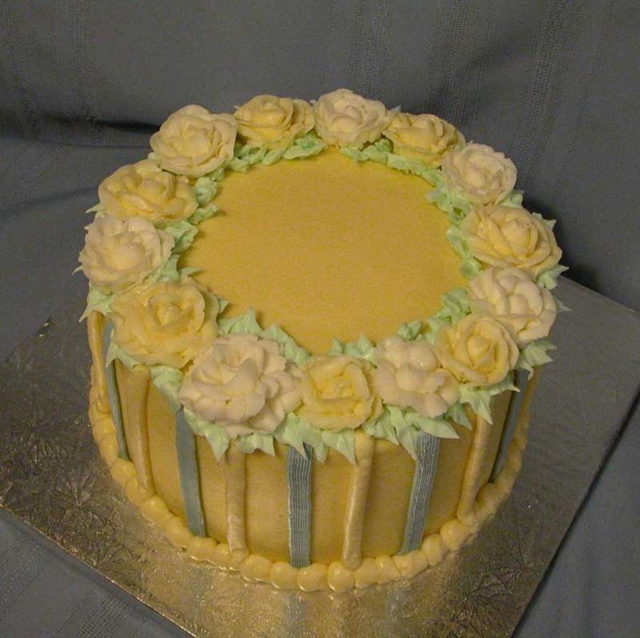 I made this for my sister-in-law's birthday. It's an 8-inch round, 3 layers of yellow cake filled with lemon cream cheese filling and strawberry jam. Iced and decorated in buttercream.