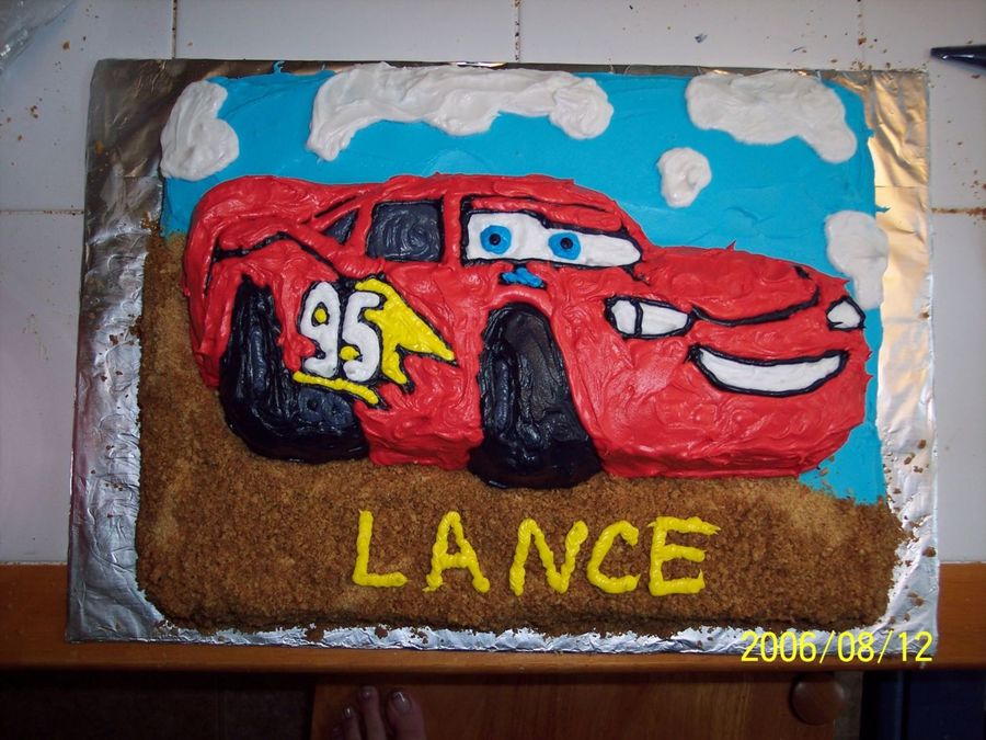 Lightning McQueen cake made with Wilton pan on top of 12x15 sheet cake. I crushed cinnamon graham crackers for the road.