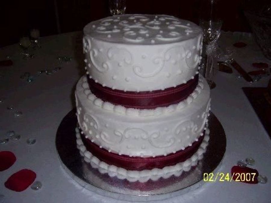 Small wedding with 10" & 8" white cake with all buttercream and ribbon.