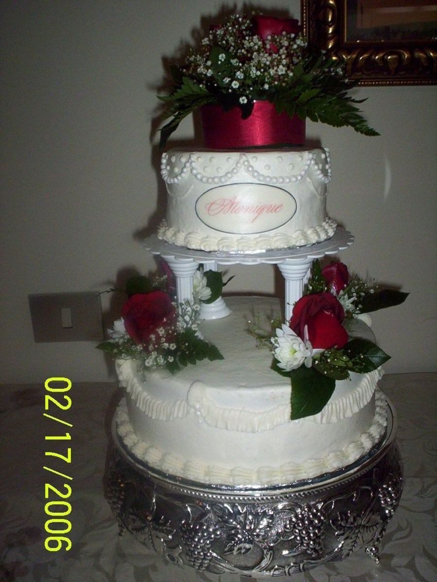 This is a 10" and 6" yellow cake filled with B/C and B/C icing. Her husband ordered the cake and wanted roses all over it. I must say they were pleased....It wasn't what I expected....maybe I'll get it right next time!!