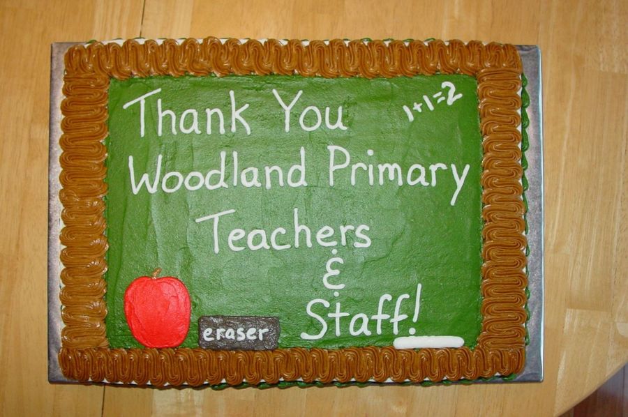 This is a 1/2 sheet cake. Half is a strawberry cake with vanilla creme filling, a recipe that I found on CC. The other half is a french vanilla cake with butterscotch buttercream frosting for the filling. Frosting is all buttercream. I used the leftover butterscotch frosting to make brown for the chalkboard edge. I got this idea after looking at several other chalkboard cakes here on CC. Thanks for the ideas! Hope the teachers love it.
