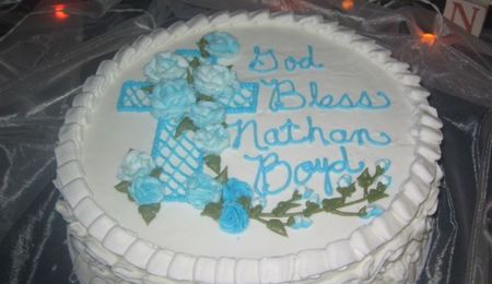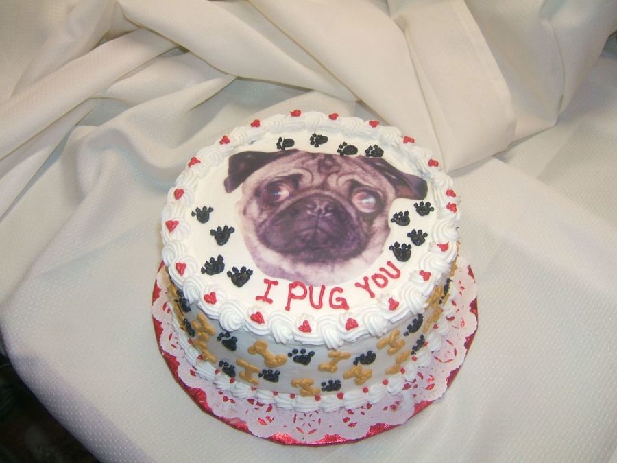 Photo of Maggie the Pug copied onto frosting sheet. Dog bones and paws decorate the sides. Hearts and paws on top. Triple chocolate cake iced in buttercream.