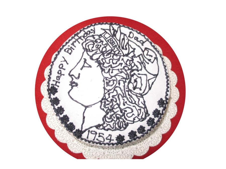 cake for my father in law who loves coin collecting. This cake was a pure headache to do, my icing kept sliding off the side of the cake, my bct wouldn't come off the paper and literally crumbled so i had to free hand the majority of the image. I learned one thing from this cake, i'll never do another one like this one again. Any hints, suggestions, critiques welcome.