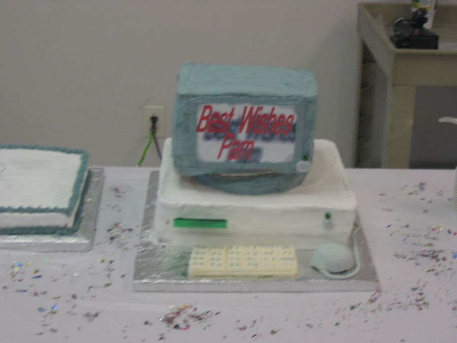I made this computer for a lady who had been in computers for 40 years and this was her retirement cake. It is all cake with buttercream and plastic report cover printed for the screen, chocolate keyboard and fondant covered cake for mouse.