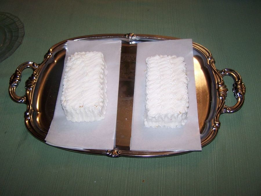 Posting these just to share how I do a sampling with my brides. This is one 6" single layer square cakes that have been cut in half. Both are torted and filled with a different filling (usually white BC and red raspberry). I use the star tip to put a zig-zag design on them. After they have thawed, it takes me less than 10 minutes to prep these cakes for the bride's sampling appointment. Any leftovers go home with the bride.