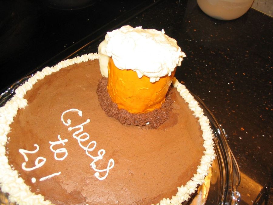 my enthusiam exceeded my talent here :) but I had fun making this cake for DH's birthday. The mug is cake baked in a small can (this was a disaster-the cake came out all distorted) Chocolate IMBC, beer mug s regular IMBC with white chocolate handle. The handle is attached to the beer mug with toothpicks