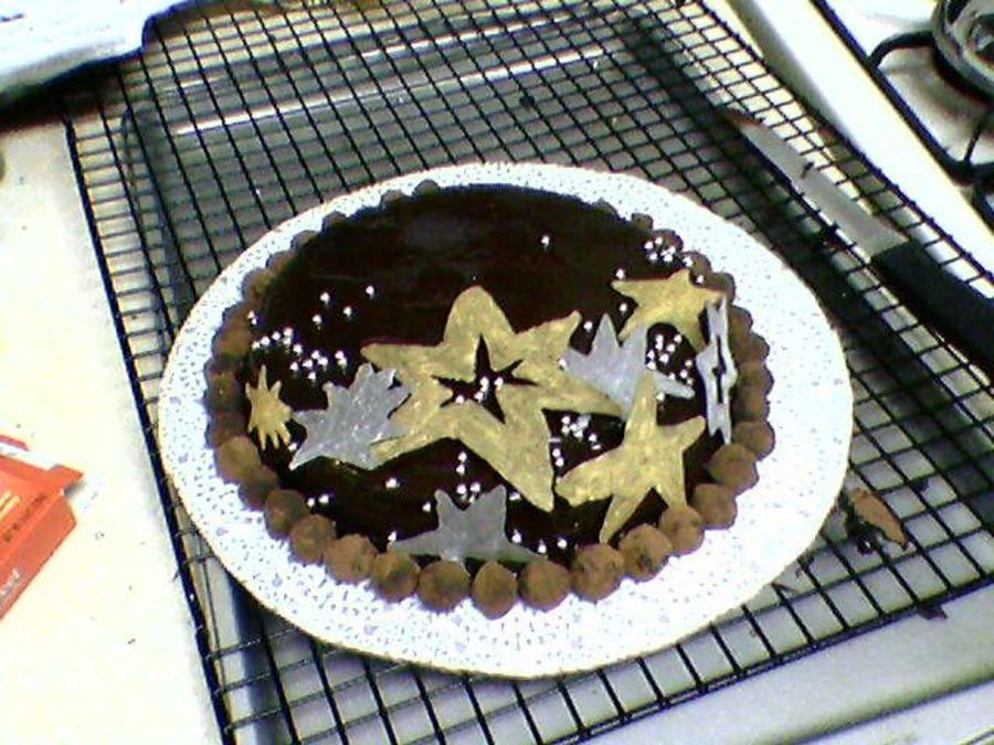 This is a flourless chocolate truffle cake with a chocolate ganache with simple chocolate method stars brushed with gold and silver luster dust, alongside silver dragees. Lining the cake are homemade chocolate truffles. Aesthetically it's rather challenged, standing only an inch and a half tall with slanted sides, but BOY.... I could only eat 1/4 of the cheesecake sized slice I cut for myself before my chocometer blew a whistle. It was FANTASTIC!