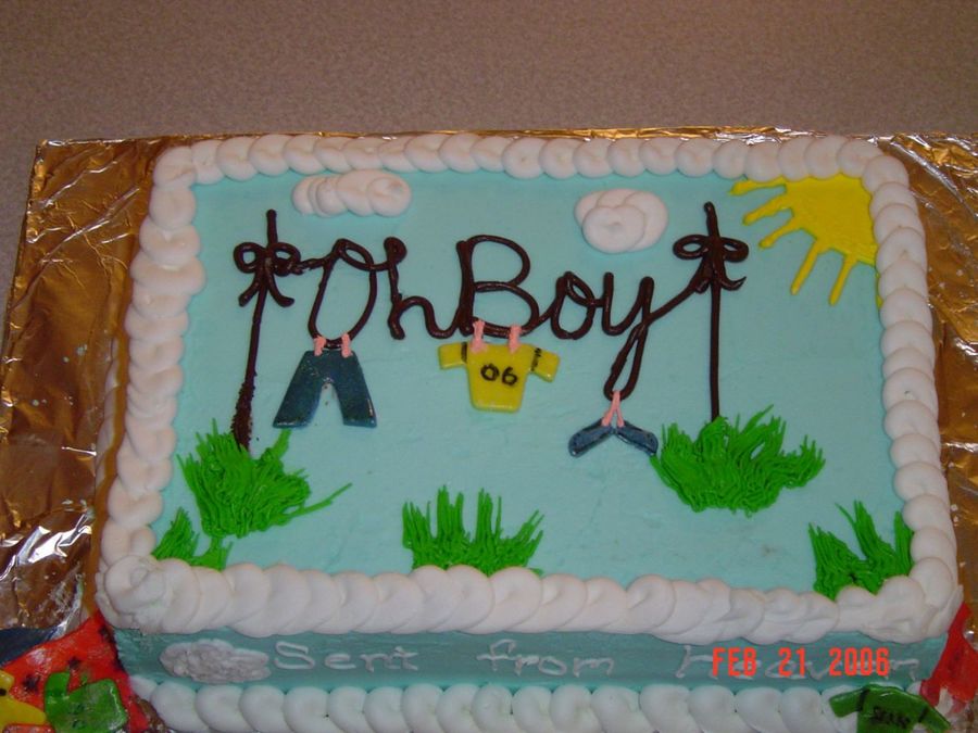 This was my first clothesline cake. My free-hand laundry basket turned out a bit big and had to take it off of the top of the cake and place it off to the side which smudged the decoration on the left. But I think it turned out pretty well considering it was 2am when I finished.